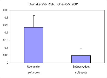 Figur 27. Sammenligning af anvendelse eller udeladelse af kraven Snäppskyddet ved plantning i 'softspots' - mineraljordshuller efter rodvæltning i forbindelse med stormfald. Lokalitet: Grønske afd. 25b. Træart:RGR. Stormfaldsareal uden skærm. Forsøget anlagt foråret 2001 - opgørelse af gnav efter skalaen 0-5 i efteråret 2001. Bemærk at alle gnavskader er under 0,25 på en skala fra 0-5. Dette er et relativt lavt skadetryk.