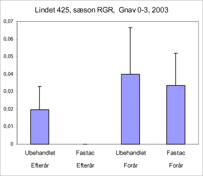 Figur 39. Effekten af plantetidspunkt samt pyrethroidbehandling. Lokalitet: Ratzeburg Plantage afd. 6. Træart: RGR. Ipyrethroidbehandling med Alpha-Cypermethrin, (Fastac). Arealet er et stormfaldsareal uden overstandere. Der er plantet i planterille på arealet. Forsøget anlagt i efteråret 2002 og i foråret 2003 - opgørelse af gnav efter skalaen 0-3 i efteråret 2003. Bemærk at alle gnavskader er under 0,2 på en skala fra 0-3. Dette er et lavt skadetryk.