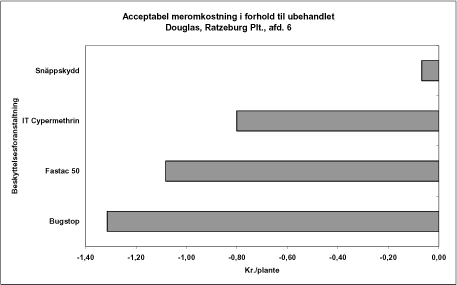 Figur 6. Acceptabel omkostning pr plante, der kan investeres i plantebeskyttelse for at opnå en bevoksningskvalitet, der er lige så god som i de ubehandlede parceller. Gældende for rødgran i afd. 541/543 Endrup Skov, Lindet Statsskovdistrikt. I rødgranparcellerne har skadetrykket været meget lavt og den gennemsnitlige planteafgang har ikke for nogle af forsøgsledene været over 10%. Således er der hverken basis eller behov for at gennemføre beskyttelsesforanstaltninger.