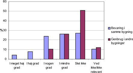 Kilde: 10 spørgeskema besvaret af aktører i branchen Spredningen på besvarelserne omkring potentialet for affaldsforebyggelse er samtidig forholdsvis stor, hvilket bl.a. afspejler deltagernes forskellige viden og holdninger til affaldsforebyggelse, men nok i ligeså stor grad skyldes, at de adspurgte har forskellige arbejdsområder og typer af renoveringsprojekter. Det viser endvidere, at der er vanskeligt at generalisere de potentialer, der ligger for affaldsforebyggelse indenfor de enkelte byggematerialer. Ligeledes giver de foreliggende data heller ikke mulighed for at opskalere resultaterne. 4.4 Muligheder og begrænsninger for bevaring og genbrug ved renoveringI det følgende behandles de enkelte materialetyper nærmere med henblik på, at vurdere muligheder og begrænsninger for bevaring i samme bygning eller genbrug i andre bygninger. 4.4.1 MurstenDe arkitektoniske overvejelser om ruminddeling er afgørende for i hvilket omfang, der skal rives vægge ned. Overvejelser om affaldsforebyggelse er reelt underordnet disse forhold. I det omfang nedrivninger besluttes, er der typisk god fornuft i at genbruge sten i samme byggeri, idet stenene har samme mål, udseende m.v. Endvidere undgås nyindkøb og transporten væk. Udtagning og rensning af mursten sker dog i langt mindre omfang i dag end tidligere på grund af de højere lønomkostninger. Maskinel afrensning har været anvendt med varierende held med forskellige typer af murstensrensere. En ny model har set dagens lys, hvilket bl.a. er sket med udviklingsmidler fra Miljøministeriet. Det er vanskeligt at vurdere i hvilket omfang dette koncept kan åbne mulighederne for større genbrug på området. I ældre byggeri er murstenene typisk muret op med ren kalkmørtel, hvilket giver gode muligheder for afrensning. I modsætning hertil anvendes der i nyere byggeri typisk mørtel med et vist cementindhold, hvilket vanskeliggør afrensningen. Det er endvidere vigtigt at skelne mellem for- og bagmursten i sortering og anvendelse, idet bagmursten til indermuren til tider ikke har de samme styrkeegenskaber som formursten og ikke er frostsikre. Styrkeegenskaberne ved ældre sten er sandsynligvis mindre ensartede end ved nye sten p.g.a. af produktionsmetoden. Tidligere forsøg har dog vist, at genbrugte mursten har gode trykstyrker, [DTI/ Murværkscentret 1994]. Hvis der er behov for at sikre bestemte styrkeegenskaber efter den gældende norm (DS414) kan der foretages trykprøvning. Derudover er der udviklet en metode til karakterisering af mursten til genbrug v.h.a. skærvfarven, [DTI/Murværkscentret, 1992]. 4.4.2 BetonelementerEn af de primære muligheder for at forebygge betonaffald er, at foretage de nødvendige renoveringer og reparationer af betonelementerne løbende. Derimod kan det være vanskeligt at genbruge betonelementer i andre byggerier, hvilket primært skyldes to forhold. For det første er betonelementerne ofte dimensioneret specifikt til den pågældende konstruktion. For det andet er det ofte vanskeligt at adskille betonelementer, idet samlinger typisk består af en sammenkobling af armeringsjern, som efterfølgende er udstøbt med beton. Der er dog mulighed for at genbruge betonelementer, hvis de er spændt sammen med wires, som det nogle gange er tilfældet i siloer og andre beholdere. Ved nyere betonelementbyggeri er der endvidere den ulempe, at andre bygningsdele er støbt ind i beton og derfor svære at skille derfra. Det gælder f.eks. vinduesrammer og ventilationsrør. Hertil kommer sandwichelementer, der skal skilles for at fjerne isoleringen. 4.4.3 Tagsten og anden tagbeklædningÆldre håndstrøgne tagsten af tegl har ofte en meget god kvalitet og lang holdbarhed. Ved renovering bør det derfor nøje overvejes om tagsten af tegl af ældre dato skal skiftes ud med nyere typer af sten. De ældre teglsten har samtidig en arkitektonisk værdi pga. af patinaen, udformningen m.v. Specielt gamle glaserede tagsten er værdifulde. Genbrug af tagsten af tegl på andre bygninger afhænger af hvorvidt nedtagningen er rentabel. Dette afhænger igen af, hvor stor en andel af tagstenene der kan genbruges. Nedtagningen af tagstenene kræver en nænsom arbejdsgang, herunder afrensning af mørtel, når der er understrygninger. Der eksisterer i dag enkelte lagre med gamle typer af tagsten. De gamle typer er ofte lavet på teglværker, som i dag er nedlagte eller kun producerer nye modeller. Tagsten af skifer er naturprodukt, som repræsenterer en høj handelsværdi. Erfaringer viser, at der kan være en aldersmæssig begrænsning på skiferens holdbarhed, hvilket kan skyldes graden af vedligeholdelse, samt evt. forhold som luftforurening m.v. Dette har betydning for, om nedtagningen er rentabel. Erfaringer med genanvendelse af tagsten i tegl og skifter er beskrevet nærmere i [Miljøstyrelsen, Arbejdsrapport nr.44, 1994]. På nyere byggerier, herunder industribyggeri anvendes ofte store arealer med plader af forskellige materialer. Dette er nærmere beskrevet under facadebeklædning. 4.4.4 FacadebeklædningEn række forskellige materialer benyttes til facadebeklædninger, herunder bl.a. fibercement, træ, stål, aluminium, plast og mineraluld. Monteringen er ofte baseret på monteringssystemer, hvilket giver mulighed for systematisk demontering. I forbindelse med nogle materialer benyttes der dog også lim og/eller fugemasse, hvilket vanskeliggør demontagen. Facadebeklædningen er meget udsat for sol, vind og regn, hvilket resulterer i slid, nedbrydning og tæring. Dermed mister materialerne i første omgang deres oprindelige udseende og siden deres funktionalitet. Dertil kommer forhold som dimensioner, borehuller m.v., der skal passe med det nye byggeri. Det er praksis primært facadebeklædning i form af metalplader, der genbruges. 4.4.5 Vinduer og døreVinduer og døre er typisk nogle af det bygningsinventar, der bevares og istandsættes i ældre ejendomme. Det sker ofte i forbindelse med bevaring af ældre bygninger, hvor man