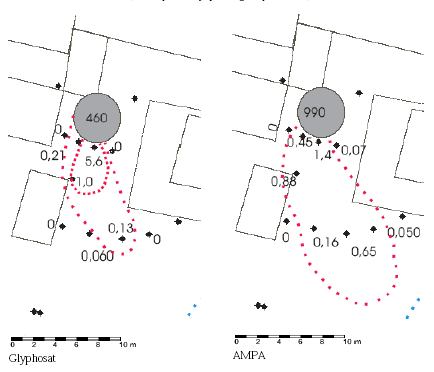 Figur 6a. Glyphosat og AMPA (µg/l). Ajlebeholderen, hvortil vaskepladsen (tilstødende rektangel) drænes, er markeret med gråt. Strømningsretningen er mod syd–sydøst. Udbredelsen af AMPA er ca. 40 m. Lokalitet 2 Det er klart, at de høje koncentrationer af glyphosat og AMPA i ajlebeholderen blandt andet kan relateres til vask, der er foregået i nyere tid, hvilket vil sige 2004. Der er første gang analyseret for glyphosat i en boring i forureningsfanen i 1999. Senere målinger har vist et forholdsvis konstant niveau af glyphosat/AMPA siden 1999. Dette indikerer, at glyphosat og AMPA tidligere har været anvendt på lokaliteten, hvilket er bekræftet gennem den historiske redegørelse. Det må således forventes, at der flere gange gennem hele anvendelsesperioden for glyphosat, har været høje koncentrationer af glyphosat og AMPA i ajlebeholderen, svarende til de koncentrationer, der er observeret i forbindelse med nærværende undersøgelse.