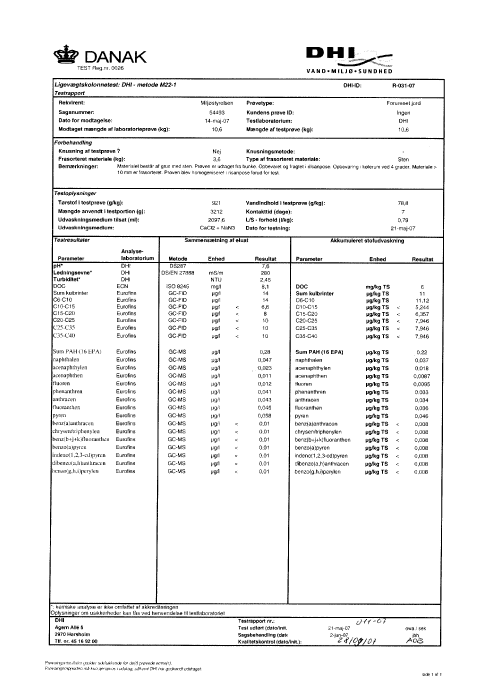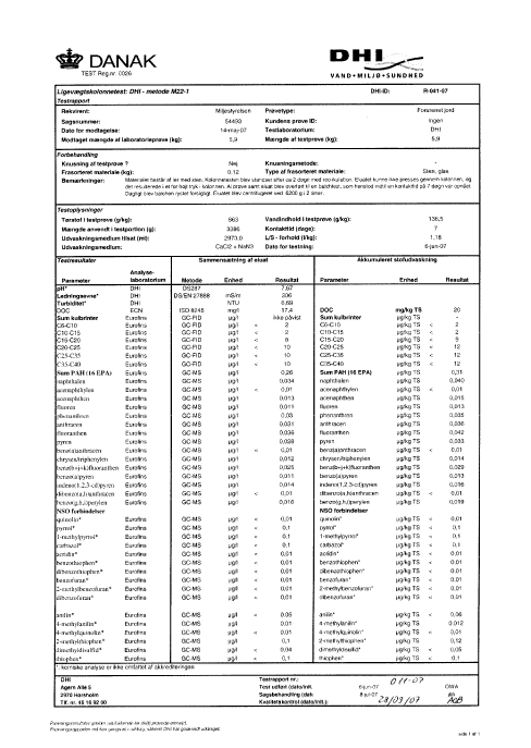 * Turbiditet måles kun i udvaskningstest for organiske stoffer. I forbindelse med gennemførelsen af dette projekt blev der indgået en aftale mellem Miljøstyrelsen og DHI om, at eluater fra udvaskningstest for organiske stoffer også skulle analyseres for NSO-forbindelser samt, at analysen for sum af kulbrinter skulle opdeles i 6-fraktioner (C6-C10, C10-C15, C15-C20, C20-C25, C25-C35, C35-C40). Denne aftale er en tillægsaftale til et tidligere projekt (”Olie i jord”), som DHI har gennemført for Miljøstyrelsen (DHI, 2007b). Resultaterne af de ekstra analyser behandles ikke i denne rapport, men fremgår af de akkrediterede rapporter, som findes i Bilag B. 2.6 Kvalitetskontrol2.6.1 Uorganiske stofferTil kvalitetskontrol er der gennemført tre blindprøvninger og to dobbeltbestemmelser. Blindprøverne er analyseret i henhold til analyseprogrammet for de øvrige prøver (se tabel 2.3), og analyseresultater for eluat af blindprøven er sammenlignet med DHI’s interne krav til blindværdier for uorganiske stoffer. Den første blindtest overholdt alle krav til blindværdien på nær kravet til blindværdien for Hg på < 0,02 µg/l, hvor der blev målt en koncentration på 0,028 µg/l Hg. Dette betyder, at detektionsgrænsen for Hg er hævet til 0,03 µg/l for prøverne undersøgt i samme testrunde (gælder prøverne R-031-07, R-036-07, R-037-07, R-038-07). De to resterende blindprøver overholdt alle krav til blindværdien for uorganiske stoffer samt DOC. Til kontrol af dobbeltbestemmelser har DHI opstillet et r-kort (et kontrolkort over den relative variationsbredde) for klorid og natrium. Det er kontrolleret, at kontrolgrænserne ikke overskrides. 2.6.2 Organiske stofferTil kvalitetskontrol i forbindelse med udvaskningstest for organiske stoffer er der gennemført tre blindtests. Resultater af blindtestning viste for én runde, at der kunne være forurening med C6-C10 kulbrinter på niveau 20 µg/l, for en anden runde kun resultater under analysedetektionsgrænserne, og for en tredje runde 35 µg/l C10-C25kulbrinter. En nærmere analyse af resultaterne for tests indeholdende jordprøver i samme testrunder viste prøver med resultater under analysedetektionsgrænserne samt prøver med høje indhold. Samlet vurderes det, at en risiko for tilfældig prøveforurening af de gennemførte tests ikke kan afvises, og der er derfor i den efterfølgende vurdering af data taget hensyn til en beregnet testdetektionsgrænse for sum og fraktioner af kulbrinter som vist i tabel 2.4. Der blev ikke påvist PAH’er ved blindtestningen (dog med én undtagelse for phenanthren, som for en blindtest blev påvist med en koncentration på 0,016 µg/l). Testdetektionsgrænsen er for alle undersøgte PAH sat lig den analytiske detektionsgrænse på 0,01 µg/l. Tabel 2.4
