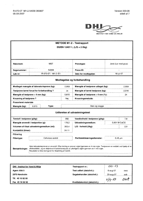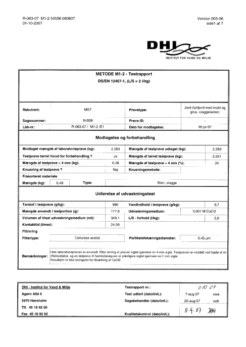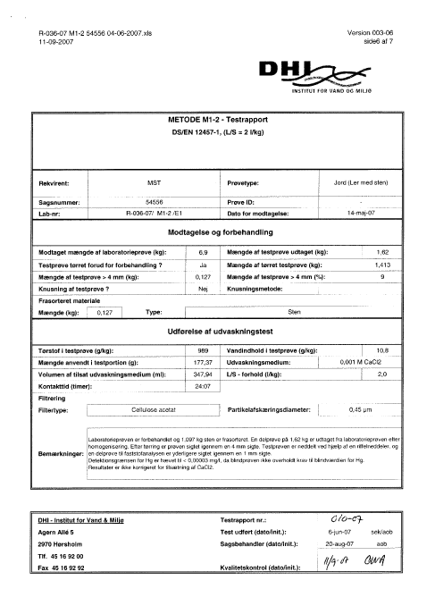 4 ReferencerCEC (2003) Rådets beslutning 2003/33/EF af 19. december 2002 om opstilling af kriterier og procedurer for modtagelse af affald på deponeringsanlæg i henhold til artikel 16 og bilag II i direktiv 1999/31/EF (berigtigelse bragt i Den Europæiske Unions Tidende 20.05.2003) DHI (2007a) Håndtering af lettere forurenet jord. Slutrapport juni 2007 DHI (2007b) Olie i jord – forslag til analysemetode og justering af jordkvalitetskriterier, samt grundlag for afskæringskriterier. Udkast til slutrapport, oktober 2007 DHI (2003) Udvaskning af organiske stoffer fra jord: Udvikling og afprøvning af testmetoder. Slutrapport januar 2003 DS 259: 2003 Bestemmelse af metaller i vand, jord, slam og sediment. Almene principper og retningslinjer for bestemmelse ved atomabsorptionsspektrofotometri i flamme DS 287:1978 Vandundersøgelser pH EN 12457-1:2002 Karakterisering af affald - Stofudvaskning – Overensstemmelsestest til undersøgelse af stofudvaskning fra granulære affaldsmaterialer og slam - Del 1: Et-trins batch-test ved et væske-faststof-forhold på 2 l/kg EN 13137:2001 Karakterisering af affald - Bestemmelse af TOC i affald, slam og sedimenter EN 27888:2003 Vandundersøgelse - Måling af elektrisk konduktivitet GEUS (2007) Grundvand – Status og udvikling 1989 – 2006. www.grundvandsovervaagning.dk Miljøministeriet (2006) Bekendtgørelse nr. 1635 af 13. december 2006 om genanvendelse af restprodukter og jord til bygge- og anlægsarbejder Scheffer, F. (1998) Lehrbuch der Bodenkunde, 14., neu bearbb. und erw. Aufl., Stuttgart, Enke Bilag A Resultater af faststofanalyse og udvaskningstest for uorganiske stofferBilaget omfatter resultater af faststofanalyser, akkrediteret laboratoriedata samt resultater fra udvaskningstest for uorganiske stoffer Klik her for at se billede af tabellen: "Resultater for faststofanalyse for uorganiske stoffer"