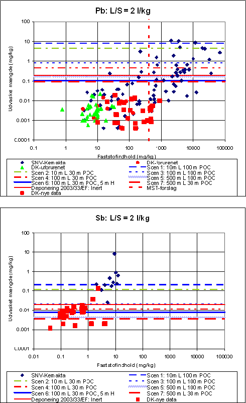 For Sb overskrider mange af de nye prøver grænseværdierne for udvaskning for scenarierne 4, 5, 6 og 7, enkelte også for scenarium 3 og EU’s udvaskningsgrænseværdi for deponering af inert affald. Ved et faststofindhold mindre end 1 mg/kg TS ligger udvaskningen for alle prøver under de udvaskningsgrænser, som sættes af scenarierne 1, 2 og 3, samt EU’s udvaskningsgrænseværdi for deponering af inert affald.. Miljøstyrelsen har p.t. ikke foreslået nogen grænseværdi for faststofindholdet af Sb. Dataene tyder på, at fastsættelsen af en grænseværdi vil være problematisk, da grænseværdien for faststofindholdet formentlig skal være omkring 0,1 mg/kg TS for at synliggøre, at de mest restriktive krav til udvaskning kan overholdes.