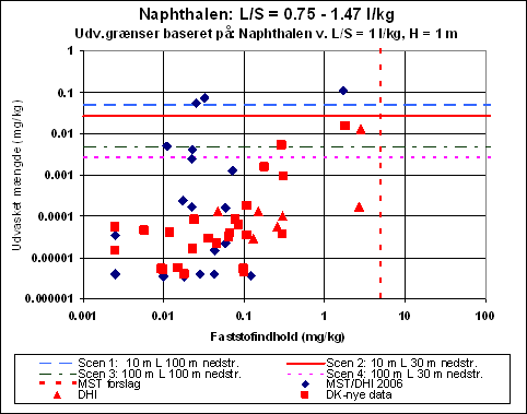 For naphthalen ses af figur 3.15, at udvaskningskriterierne for de mest restriktive anvendelsesscenarier (10 m lang, 1 m høj anvendelse, scenarierne 1 og 2) overskrides i tre ud af 57 tilfælde. For scenarierne 3 og 4 svarende til 100 m lang og 1 m høj anvendelse overskrides udvaskningskriterierne i otte ud af 57 tilfælde. Det skal bemærkes, at ingen af de undersøgte jorde har et faststofindhold større end det af Miljøstyrelsen foreslåede kriterium på 5 mg/kg ts. Beregningerne af grænseværdierne for udvaskning er foretaget med naphthalen som modelstof.