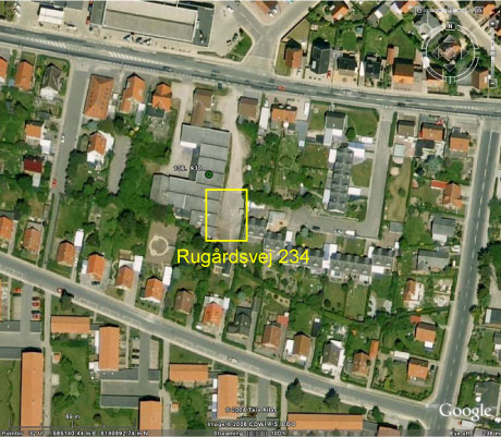 Figur 20: Luftfoto af området omkring den forurenede lokalitet på Rugårdsvej. Figur 21 viser en højdemodel af området. Terrænet er højst sydvest for lokaliteten (ca. kote 43). Nord for lokaliteten findes der smalle lavninger, der skærer sig gennem det højere landskab. Landskabet mellem lavningerne er forholdsvis fladt, og findes ca. i kote 20m. Koten ved selve lokaliteten er ca. 15 m, da den findes i en lavning. Lokaliteten ligger i et område præget af smeltevandsprocesser (Figur 21 og Figur 22). Nord for lokaliteten findes der større tunneldale og flere smeltevandsfloder, der skærer sig gennem landskabet (blå). Syd for lokaliteten findes et dødislandskab (lilla), sandsynligvis dannet under afsmeltningen af isen.