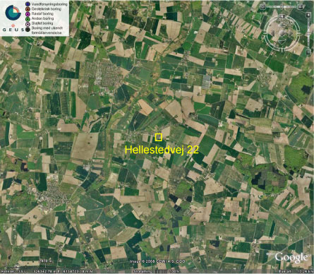 Figur 34: Hellestedvej 22, det mest forurenede område (gul firkant) og placeringen af boringer i området. C.4.1 Geomorfologisk beskrivelsePå Figur 20 ses et luftfoto af området omkring den forurenede lokalitet. Lokaliteten ligger i en mindre by, der er omgivet af landbrugsarealer til alle sider. Syd og øst for lokaliteten findes der enkelte skovområder. Nord- og sydvest for lokaliteten findes der to lidt større byer, Harlev og Karise.