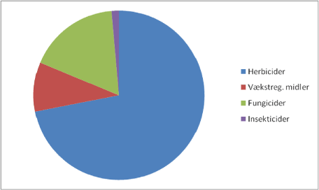 Bekæmpelsesmiddelstatistik 2009 3 Pesticidsalg og behandlingshyppighed3.1 Pesticidsalget i 20093.1.1 Det samlede salgDet samlede salg i 2009 af aktivstoffer til direkte udbringning i landbrugs-afgrøder ("sprøjtemidler") androg 2798 tons. Desuden blev der solgt små 20 tons til bejdsning af udsæd (korn, frøafgrøder og kartofler). Det er den laveste solgte mængde siden denne årlige opgørelse af pesticidanvendelsen i dansk landbrug blev påbegyndt i 1990. Salget faldt fra 2008 til 2009 med mere end 1300 tons aktivstoffer svarende til 32 %, især forårsaget af et fald på over 900 tons herbicider og 380 tons fungicider.[2] Antallet af aktivstoffer beregnet til direkte udbringning på friland i landbruget har i flere år ligget ret stabilt, og i 2009 var det samlede antal 77 mod 76 i de to foregående år. De 77 aktivstoffer fordelte sig med 41 herbicider, 5 vækst-regulerende midler, 23 fungicider og 8 insekticider. Antallet af aktivstoffer i bejdsemidler lå uændret på 9 (8 fungicider og 1 insekticid). Mængdemæssigt vejer herbiciderne traditionelt tungest i statistikken, vist i figur 3.1, således også i 2009, hvor 2012 tons svarende til 72 % af det samlede salg udgjordes af herbicider. Fungicidernes andel (484 tons) af det samlede salg på 2798 tons var lidt mindre i 2009 end i 2008, 17 % mod 21 % i 2008. Vækstregulerende midler udgjorde over 9 % af salget og insekticider 1,4 %, altså relativt set lidt mere end året før. I tabel 3.1 gives en oversigt over den overordnede udvikling i salget af sprøjtemidler gennem de seneste fire år, mens en tilsvarende oversigt for bejdsemidler er vist i tabel 3.2. Bejdsemidlerne opgøres separat fordi de har en helt anden anvendelsesmåde og dosering end sprøjtemidlerne og derfor ikke indgår i opgørelsen af behandlingshyppigheden. En oversigt over fordelingen af salget på hovedgrupperne af sprøjtemidler for 2009 er vist i figur 3.1. Mængden af de enkelte aktivstoffer solgt til landbrugsformål i 2009 kan findes i Bilag 1. Der gøres opmærksom på, at der er foretaget en mindre justering af salgstallene for 2008 siden sidste års opgørelse, jf. fodnote 1. I øvrigt henvises der til den mere detaljerede beskrivelse af de enkelte midler i nedenstående afsnit 3.1.2.